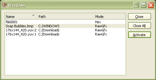 This dialog allows to manage all open file view windows. Windows can be activated and closed. The window list is sortable by filename, path, or editing mode, click on the column header to change the sort order.