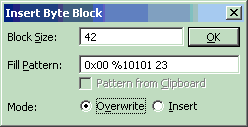 The dialog allows to specify the number of bytes to insert, the byte pattern to use, and the insert mode (insert or overwrite). In overwrite mode, the file grows, if the file end is reached.